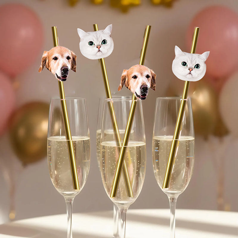 - Pet Face Straws: 2-inch photo on a 7.67-inch gold paper straw. The photo is attached with a reusable elastic band to adjust its position.