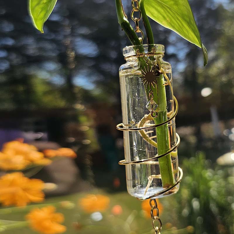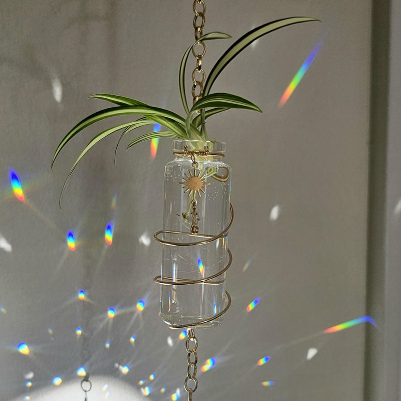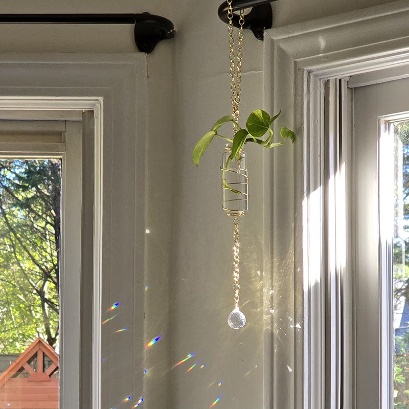 Transform your plant propagation into a stunning display of light and beauty! This handcrafted Crystal Suncatcher Propagation Station combines functionality with boho elegance, creating rainbows while your plant cuttings root and grow.