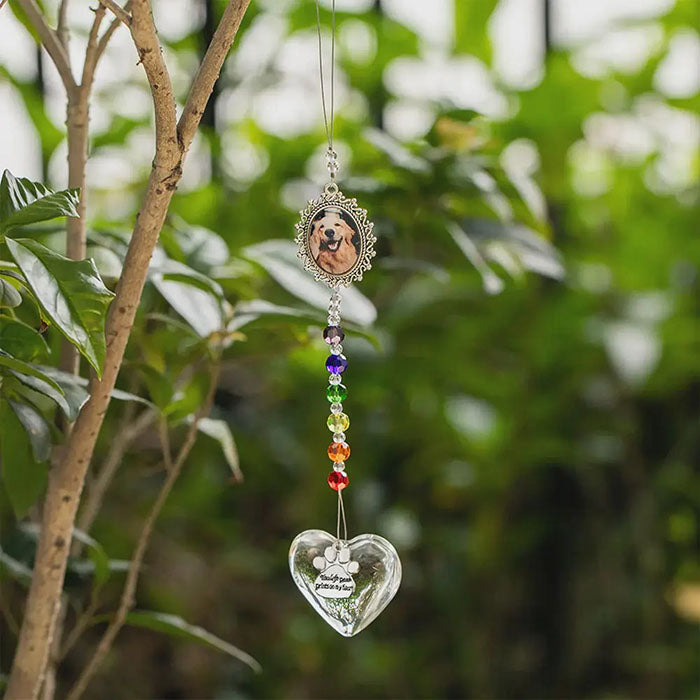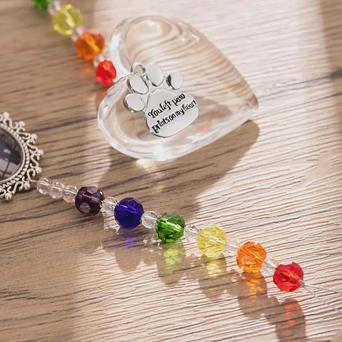 • Personalized Pet Memorial Suncatcher featuring paw prints, heart-shaped beads, and a symbolic rainbow bridge