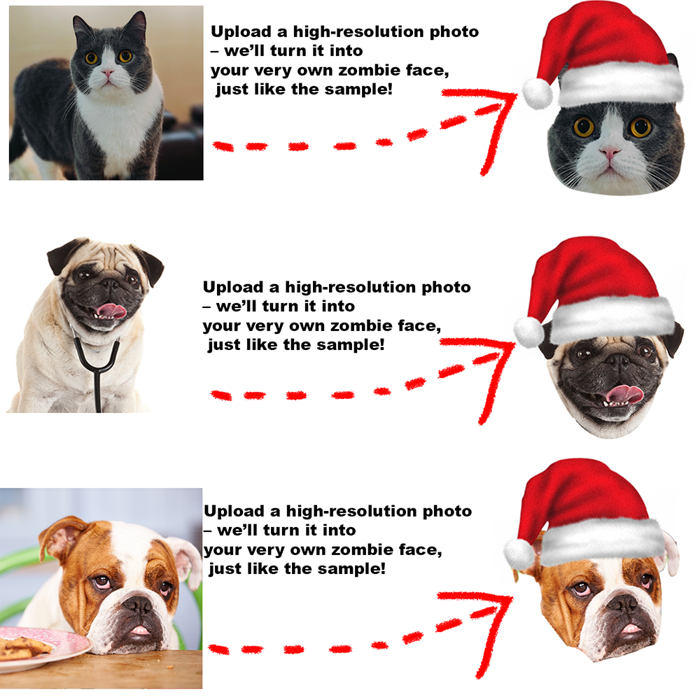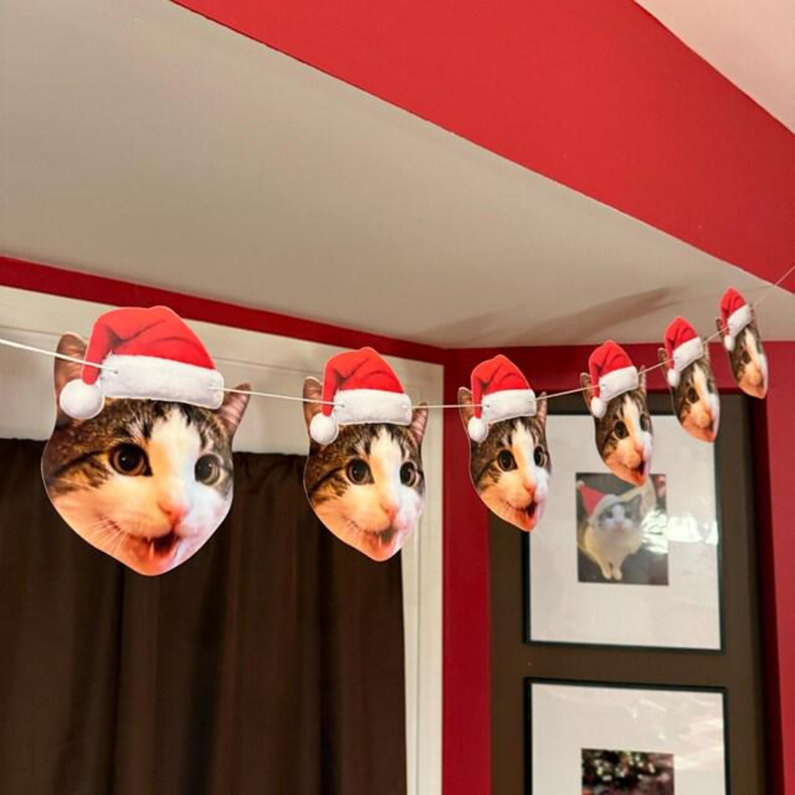 ✔️ Personalized Pet Décor: Your pet’s face — with or without a cute Christmas hat — turned into a unique party banner.