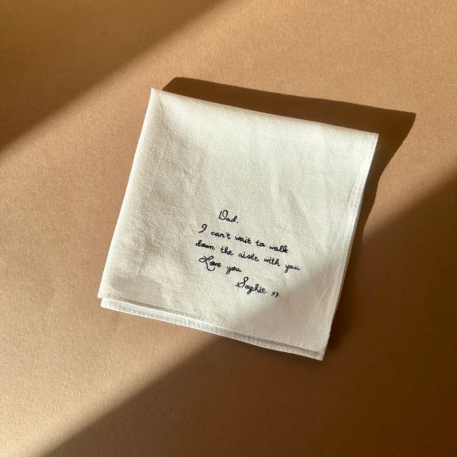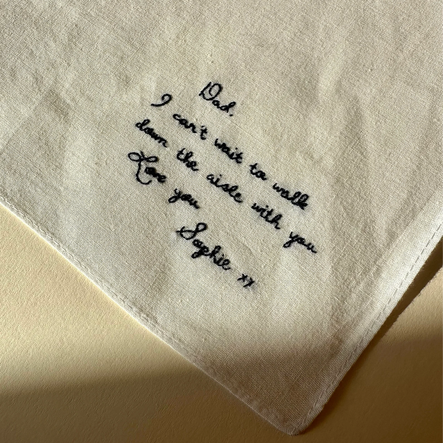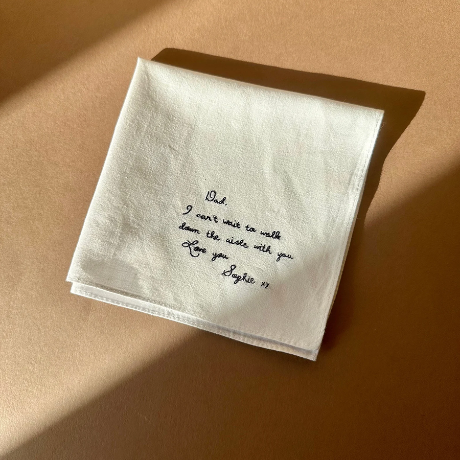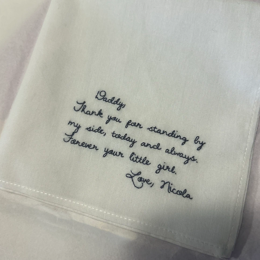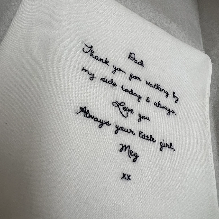Each handkerchief is crafted from 100% pure white cotton and beautifully embroidered with your chosen words using dark blue cotton thread. You can select from our elegant handwriting font, or make it truly personal by submitting your own handwriting for a one-of-a-kind keepsake.
