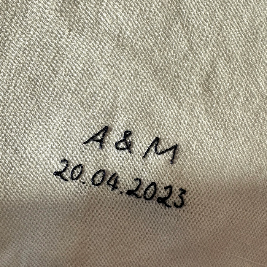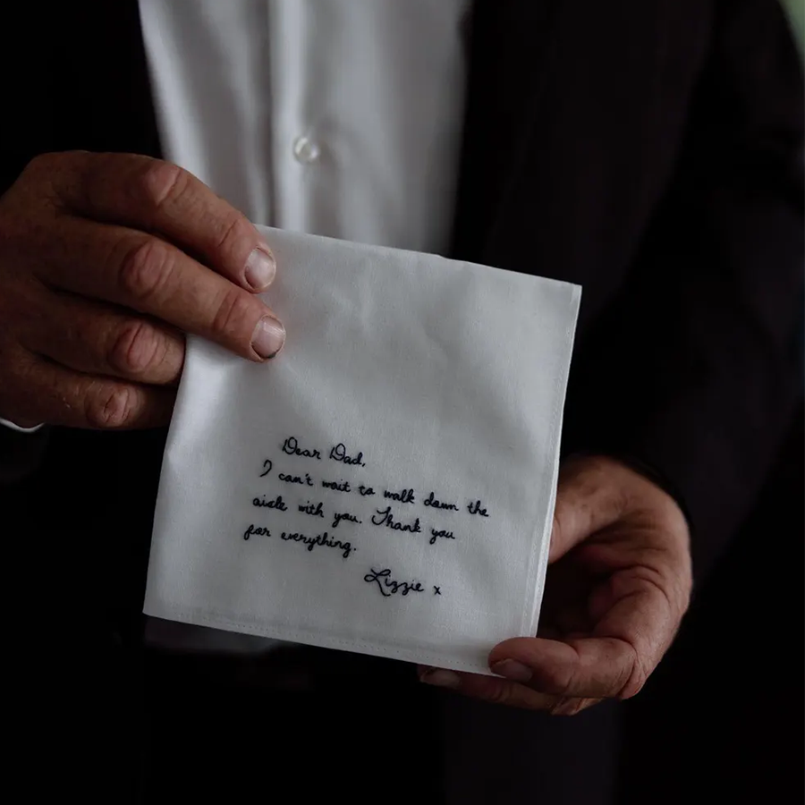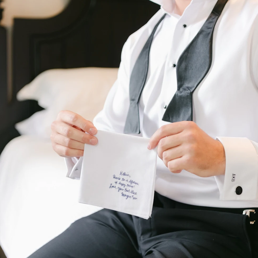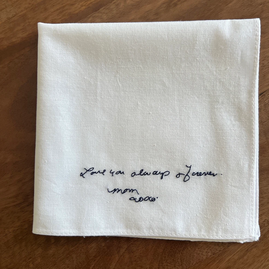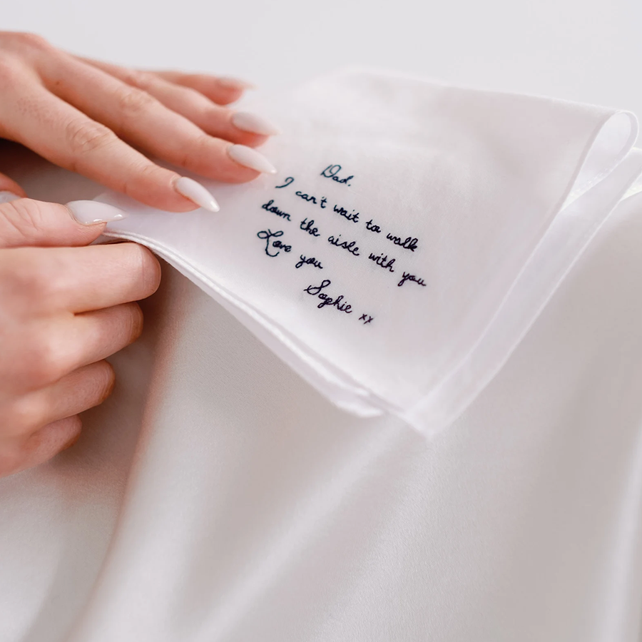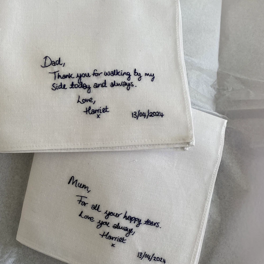 Each handkerchief is crafted from 100% pure white cotton and beautifully embroidered with your chosen words using dark blue cotton thread. You can select from our elegant handwriting font, or make it truly personal by submitting your own handwriting for a one-of-a-kind keepsake.
