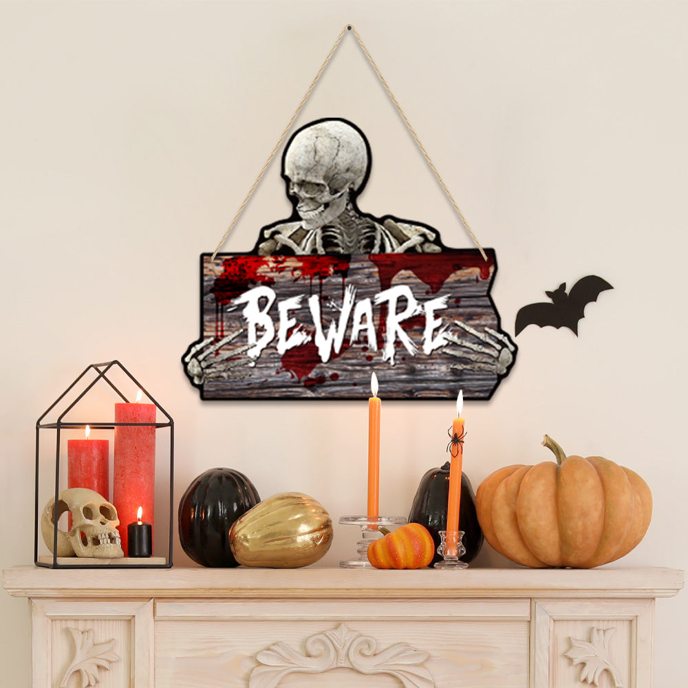 Features Halloween-themed skull graphics printed on a wooden-style background.