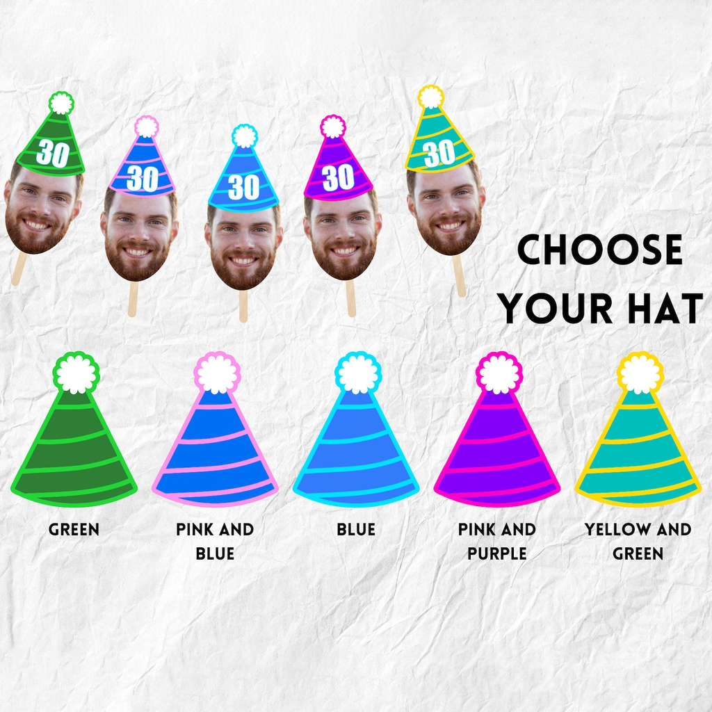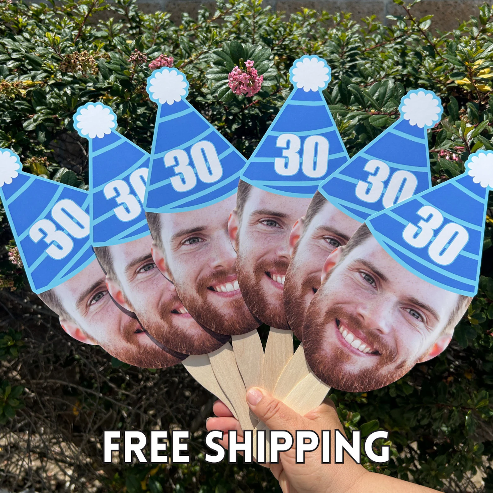 Custom Birthday Party Big Heads: Birthday-Themed Face Fan - Face on a Stick with Party Hat