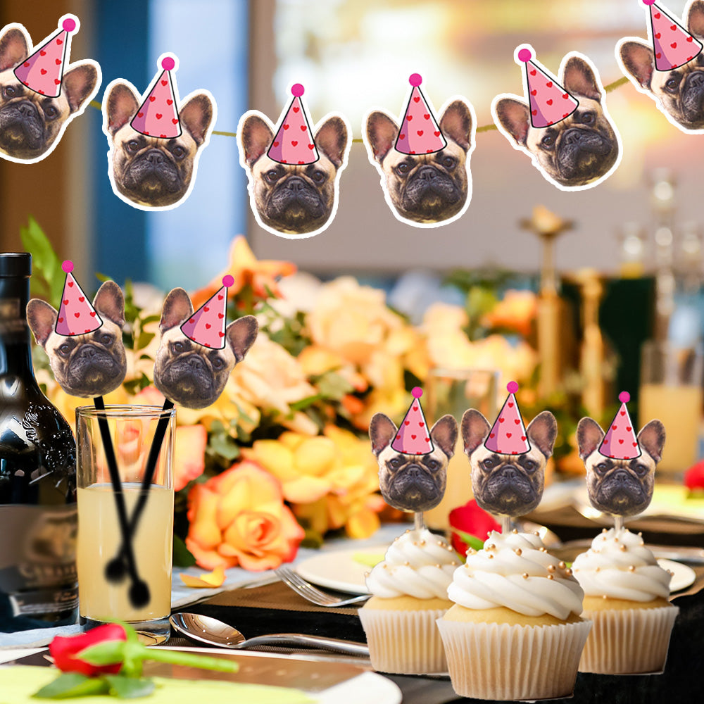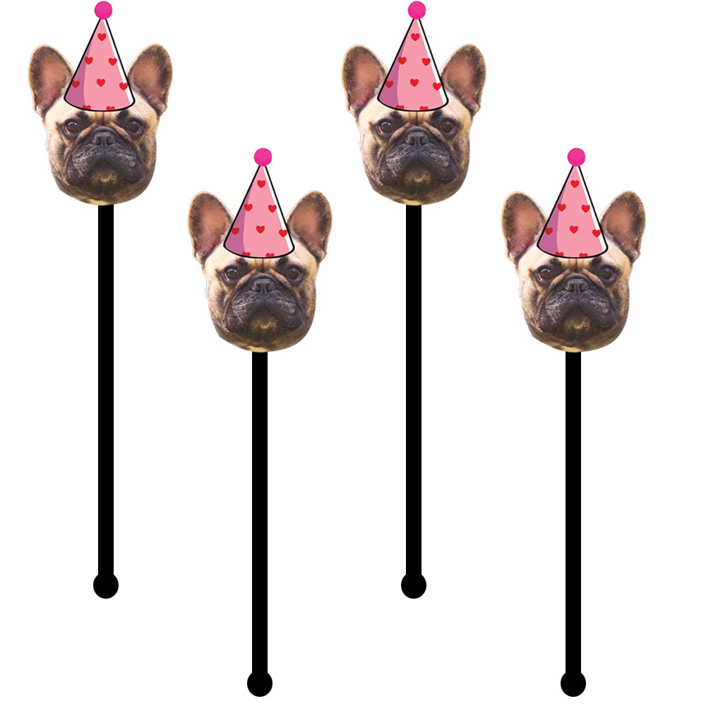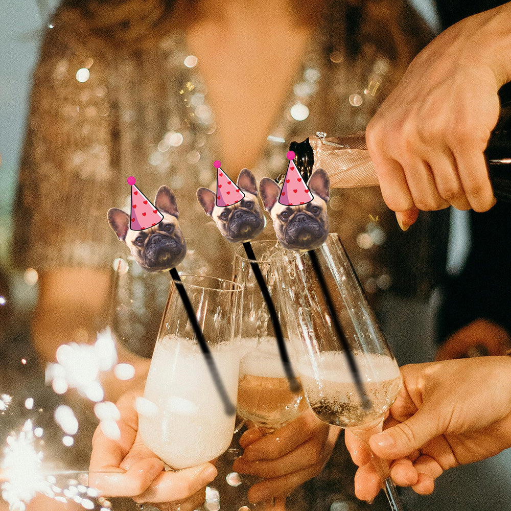 Custom pet birthday stir sticks, pet face cake flags, custom pet party straws, handmade dog birthday stir sticks, personalized cat party toppers, funny pet birthday decorations, pet party drink stirrers, custom pet themed party supplies, personalized pet celebration decor