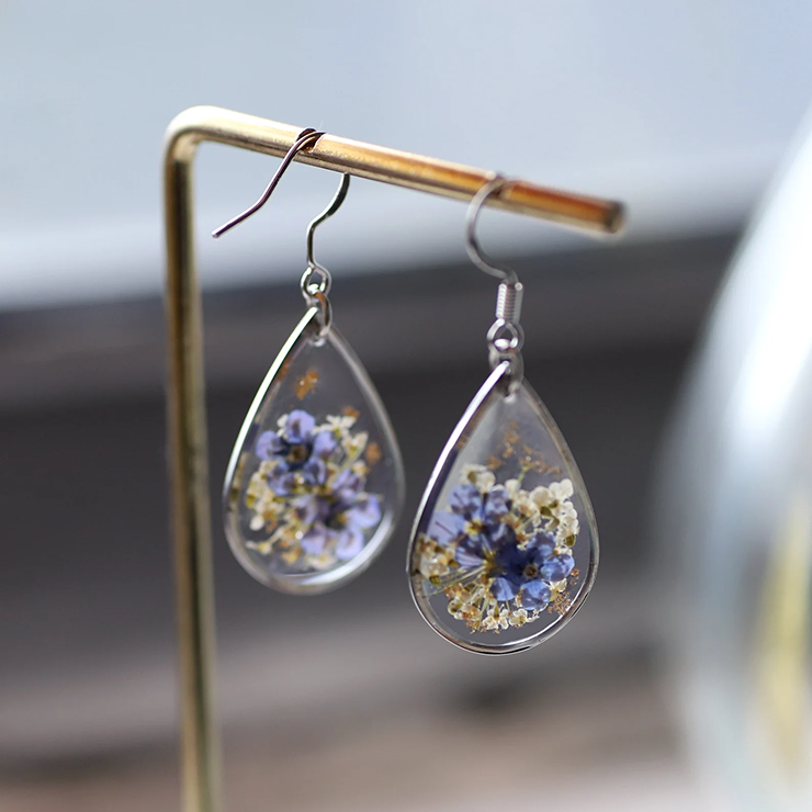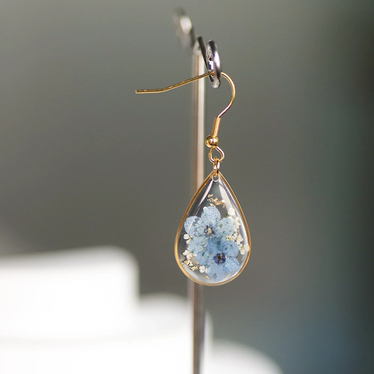 Handmade Forget Me Not Flower Earrings for Women featuring real pressed flowers preserved in high-quality resin. These dangle drop earrings highlight natural blue blooms, offering a unique, elegant accessory perfect as a Christmas gift for her or birthday gift for her. Crafted with skin-friendly materials and designed for everyday comfort, these floral earrings bring nature’s beauty to your jewelry collection.