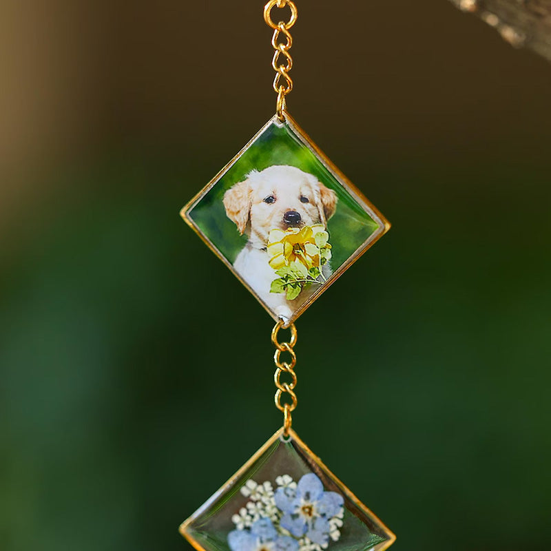 Crafted with care and intention, this pet memorial pendant combines natural beauty and personalized details. The elegant gold chain links three diamond-shaped resin pendants and a bone-shaped name tag, creating a layered, timeless design suitable for any space—your home, office, car, or dedicated pet memorial corner.